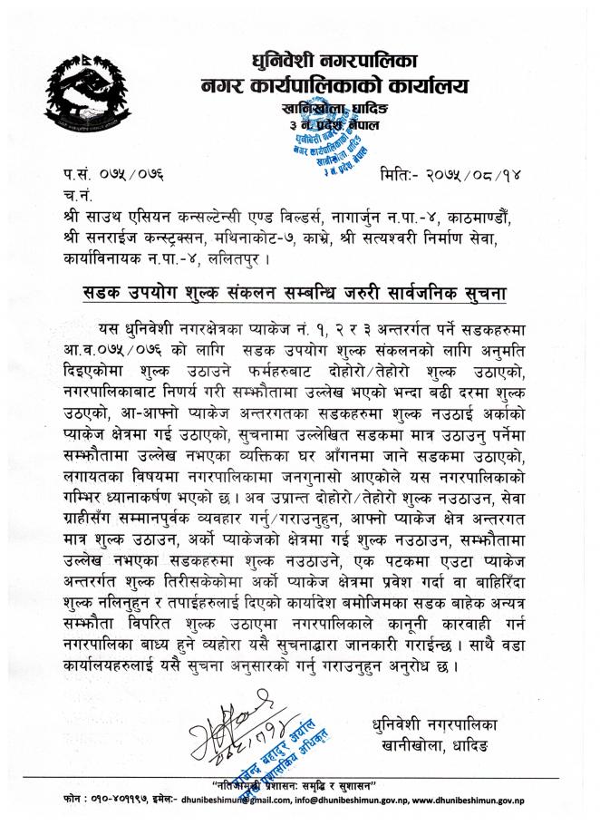 यस धुनिवेशी नगरक्षेत्रका प्याकेज नं. १, २ र ३ अन्तरर्गत पर्ने सडकहरुमा आ.व.०७५÷०७६ को लागि सडक उपयोग शुल्क संकलनको लागि अनुमति दिइएकोमा शुल्क उठाउने फर्महरुबाट दोहोरो÷तेहोरो शुल्क उठाएको, नगरपालिकाबाट निणर्य गरी सम्झौतामा उल्लेख भएको भन्दा बढी दरमा शुल्क उठएको, आ–आफ्नो प्याकेज अन्तरगतका सडकहरुमा शुल्क नउठाई अर्काको प्याकेज क्षेत्रमा गई उठाएको, सुचनामा उल्लेखित सडकमा मात्र उठाउनु पर्नेमा सम्झौतामा उल्लेख नभएका व्यक्तिका घर आँगनमा जाने सडकमा उठाएको, लगायतका विषयमा नगरपालिकामा जनगुनासो आएकोले यस नगरपालिकाको गम्भिर ध्यानाकर्षण भएको छ । अव उप्रान्त दोहोरो÷तेहोरो शुल्क नउठाउन, सेवा ग्राहीसँग सम्मानपुर्वक व्यवहार गर्नु÷गराउनुहुन, आफ्नो प्याकेज क्षेत्र अन्तरगत मात्र शुल्क उठाउन, अर्को प्याकेजको क्षेत्रमा गई शुल्क नउठाउन, सम्झौतामा उल्लेख नभएका सडकहरुमा शुल्क नउठाउने, एक पटकमा एउटा प्याकेज अन्तरर्गत शुल्क तिरीसकेकोमा अर्को प्याकेज क्षेत्रमा प्रवेश गर्दा वा बाहिरिँदा शुल्क नलिनुहुन र तपाईहरुलाई दिएको कार्यादेश बमोजिमका सडक बाहेक अन्यत्र सम्झौता विपरित शुल्क उठाएमा नगरपालिकाले कानूनी कारवाही गर्न नगरपालिका बाध्य हुने व्यहोरा यसै सुचनाद्धारा जानकारी गराईन्छ । साथै वडा कार्यालयहरुलाई यसै सुचना अनुसारको गर्नु गराउनुहुन अनुरोध छ ।