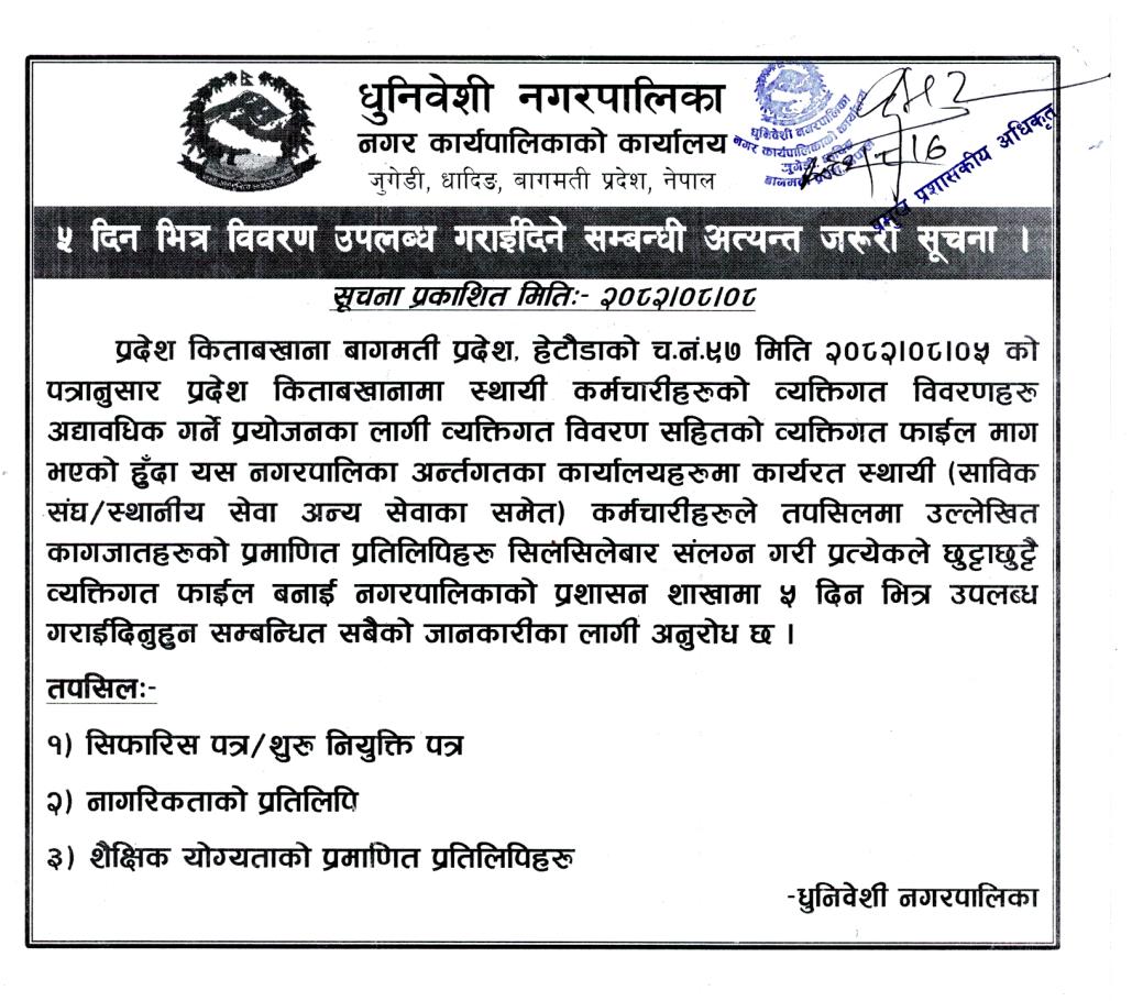Home » ५ दिन भित्र विवरण उपलब्ध गराईदिने सम्बन्धी सूचना